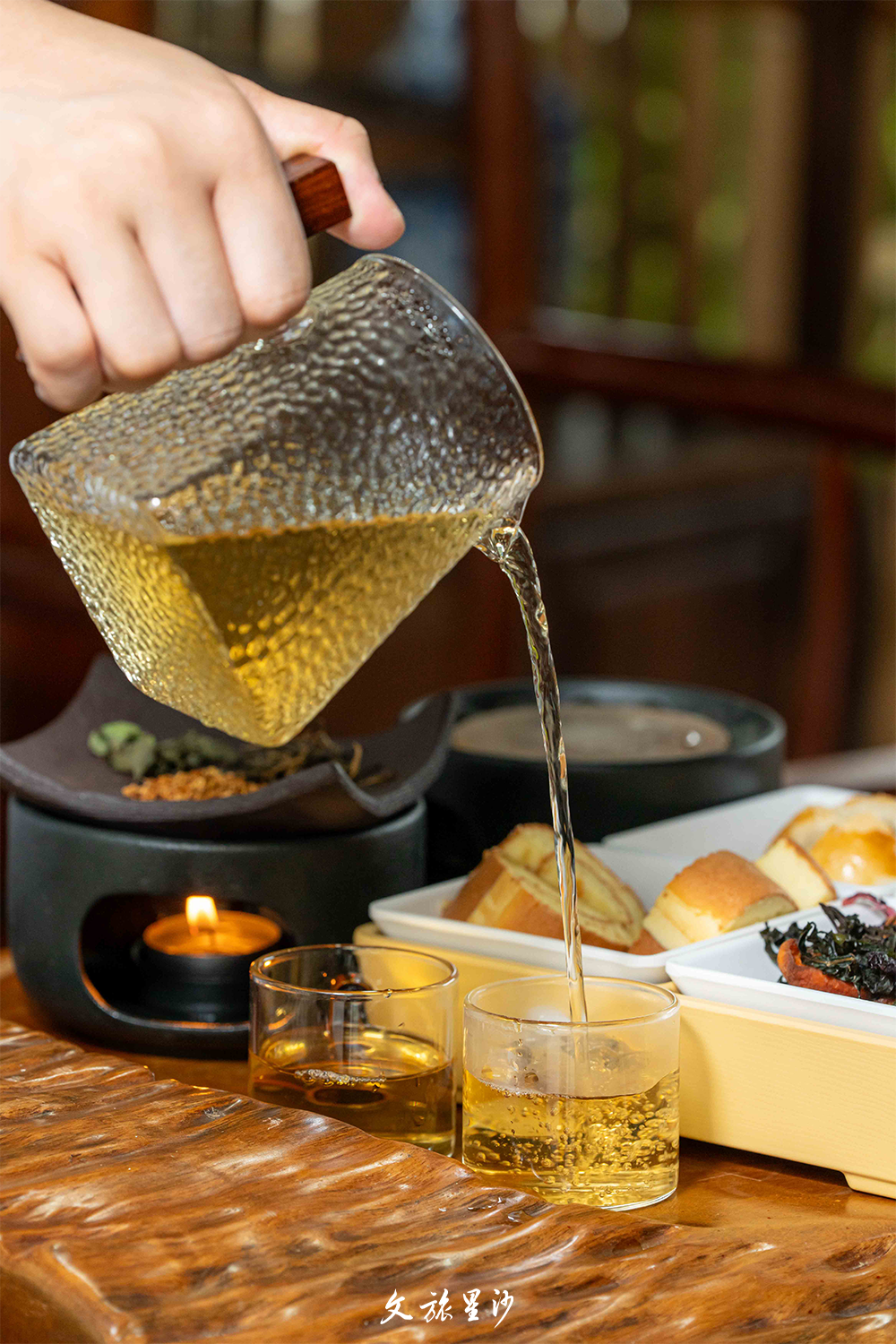 到十亩之间多肉大院喝桂花白茶,茶汤透亮桂香清雅,阳光透过玻璃洒落,时光都变得柔软;打卡初恋茶馆,芝麻豆子茶香浓熨帖,搭配酸枣饼、话梅姜等茶点,哪怕闲坐发呆也惬意自在。